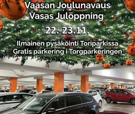 Free parking during the Christmas opening weekend! Uncategorized 21.11.2025 Tori Parkki Park for free during the Christmas opening! In honor of the Christmas opening, Vaasan Toriparkki offers free parking between 6 am and 9 pm. Welcome to the center of Vaasa to enjoy the wonderful Christmas atmosphere and do some shopping!